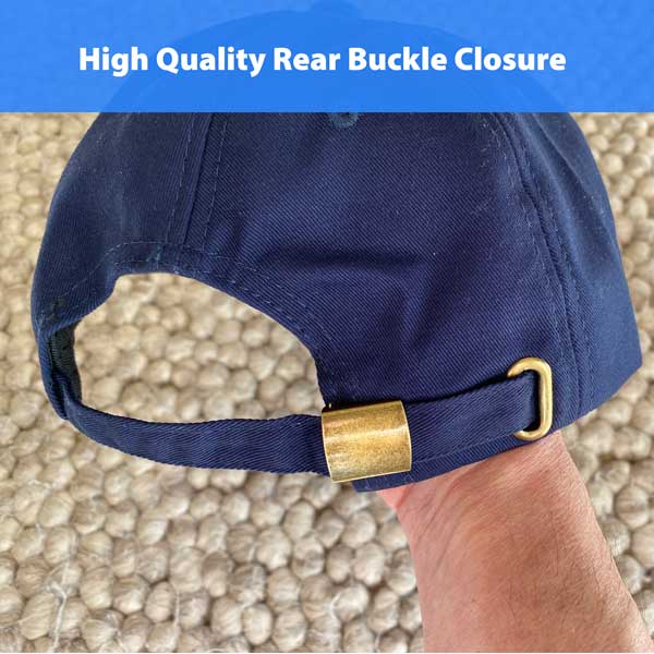 These baseball caps are a one size fits all with an adjustable buckle strap on the back.